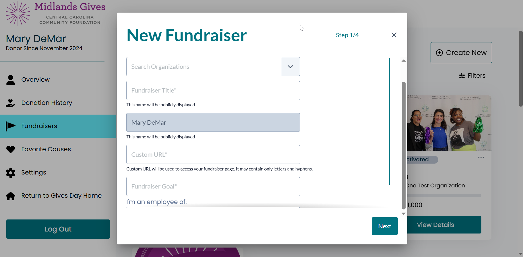 Find your favorite nonprofit using the website's search function. From the nonprofit's page, click the "Create a Fundraiser" button.